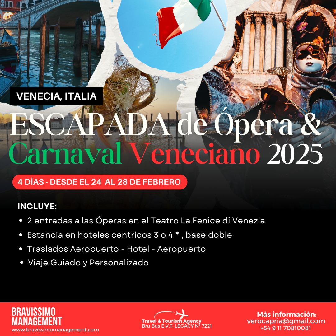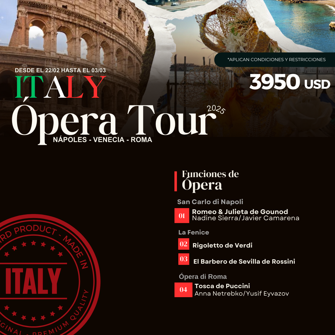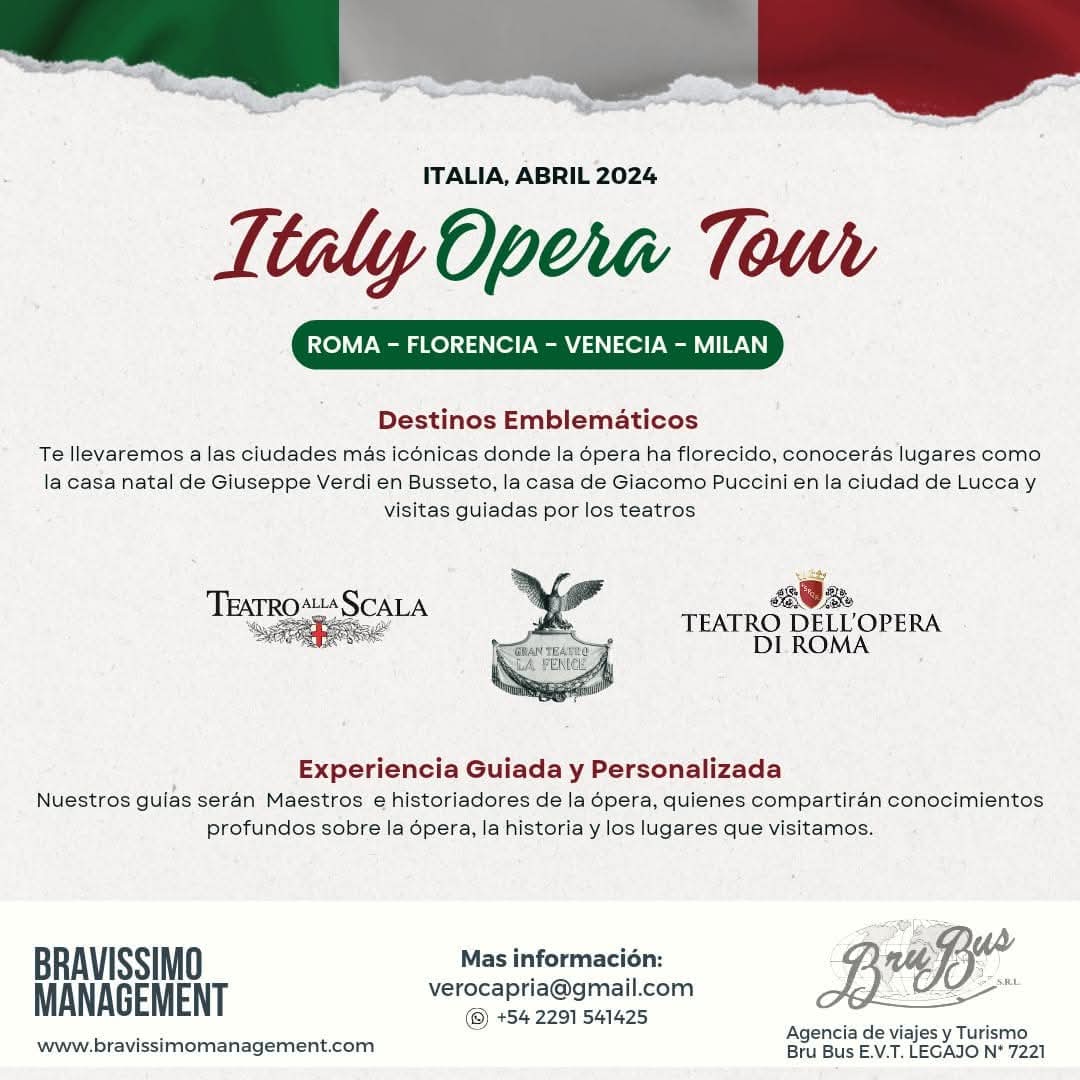 🎭 Viví la ópera en Italia con el Bravissimo Opera Tour. Salida el 10 de abril – ¡Cupos limitados! Recorremos Roma, Venecia, Florencia y Milán en un viaje de 12 días con hoteles 4★ y desayuno incluido. Incluye traslados aeropuerto–hotel y entre ciudades, visitas guiadas por expertos en ópera y conciertos privados en Roma y Parma. Disfrutá La Sonámbula en la Ópera de Roma, Mefistófeles en La Fenice, y La Rondine, Cavalleria Rusticana y Pagliacci en La Scala de Milán. Además, visitamos la casa natal de Verdi en Busseto y la casa de Puccini en Lucca.