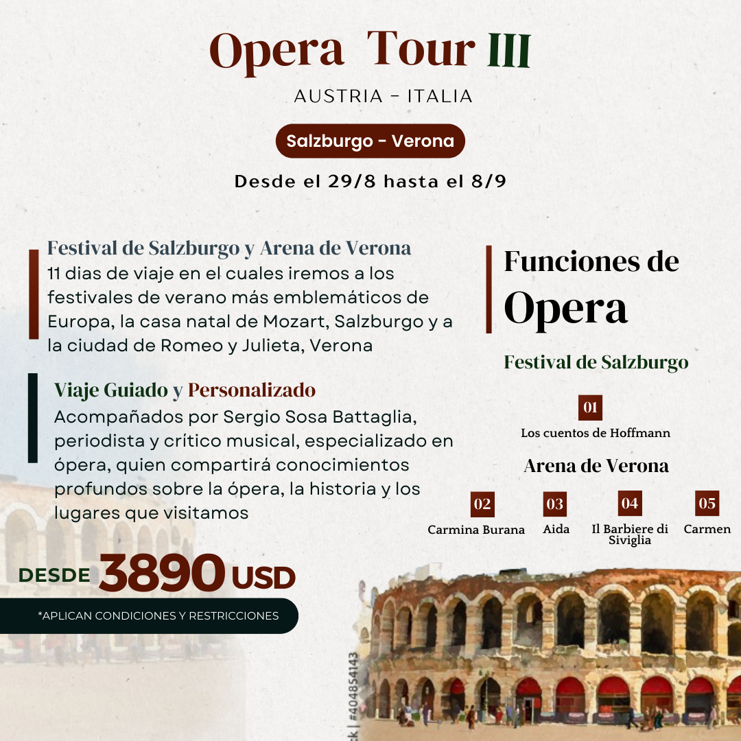 11 dias de viaje en el cuales iremos a los festivales de verano más emblemáticos de Europa, la casa natal de Mozart, Salzburgo y a la ciudad de Romeo y Julieta, Verona